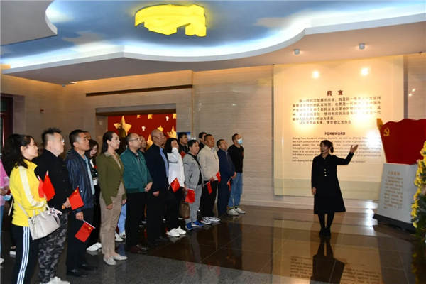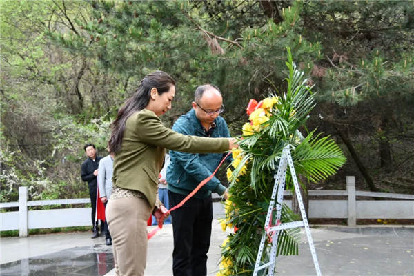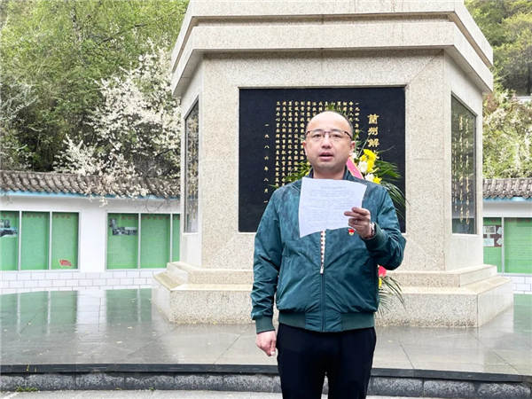 14日上午,全體人員佩戴黨徽、手持黨旗,在烈士紀(jì)念碑下全體肅立,奏唱國歌,向英烈敬獻(xiàn)花籃,重溫入黨誓詞,認(rèn)真聽講解員講解烈士們的先進(jìn)事跡。